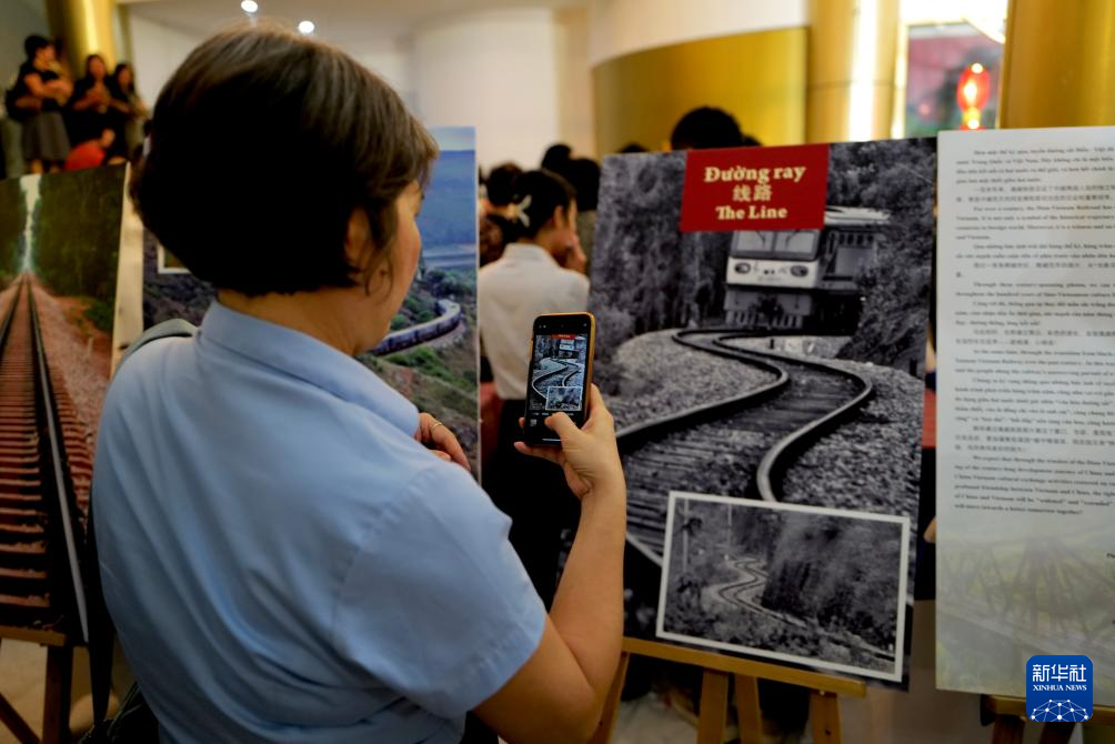 9月25日,在位于越南河内的越南国家歌舞剧院,来宾参观滇越铁路摄影展。新华社记者 刘颍 摄