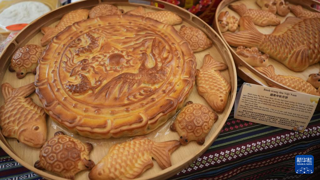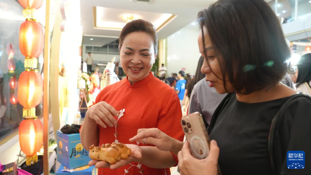 越南中秋月饼展区前,越南月饼制作手艺人丁氏秀英及其女儿用中文向中国来宾讲解越南月饼的图案寓意。这门手艺已在其家族中传承了五代。在丁氏秀英看来,中国月饼来到越南,给越南民众带来的不只是别样的味道,更是两国中秋文化的融合、对团圆与睦邻的共同期许。