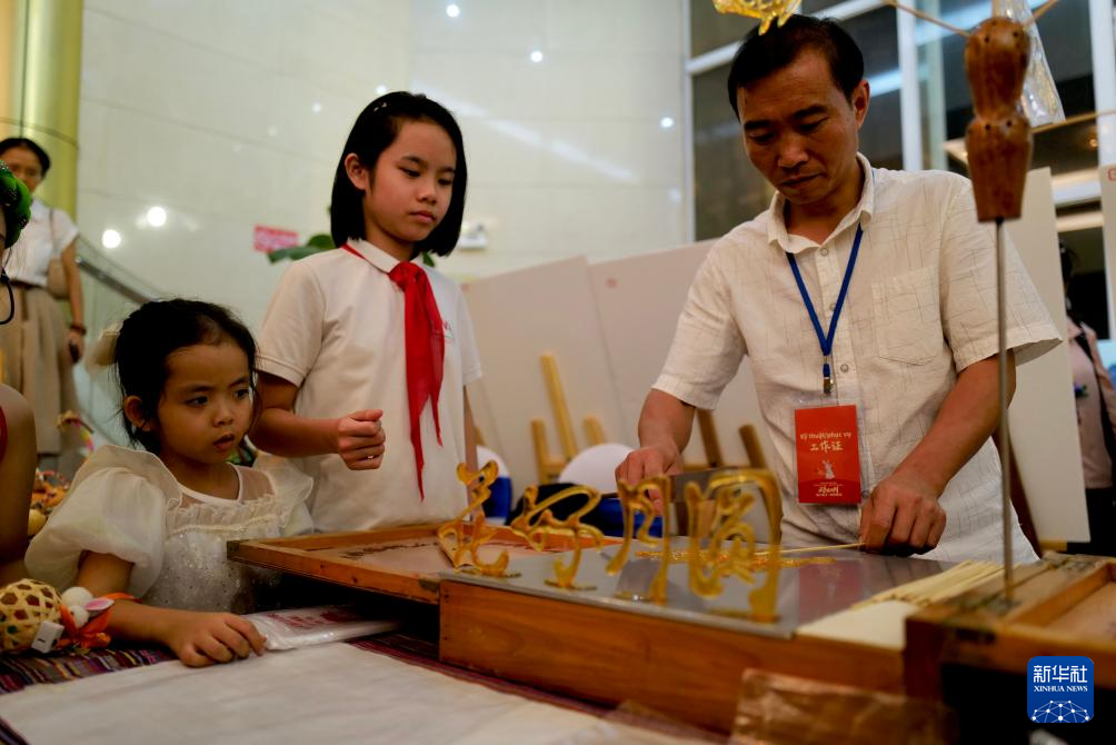 9月25日,在位于越南河内的越南国家歌舞剧院,越南儿童观赏写着“花好月圆”的中国糖画。新华社记者 刘颍 摄