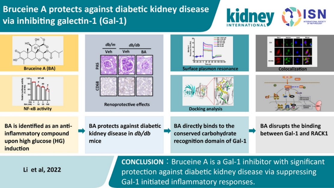 2022年5月19日,米乐mile官方网站医药生物技术研究所王真团队在肾脏病研究领域权威杂志Kidney International在线发表了题为“Bruceine A protects against diabetic kidney disease via inhibiting galectin-1”的研究论文。该研究发现提取自中药鸦胆子的苦木素类单体鸦胆子素A具有良好的体外抗炎作用及体内抗炎和抗糖尿病肾病的保护作用。