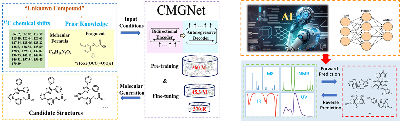 图2. (左)GMGNet模型基于13C NMR结构解析的工作流程;(右)AI在四大光谱中的应用