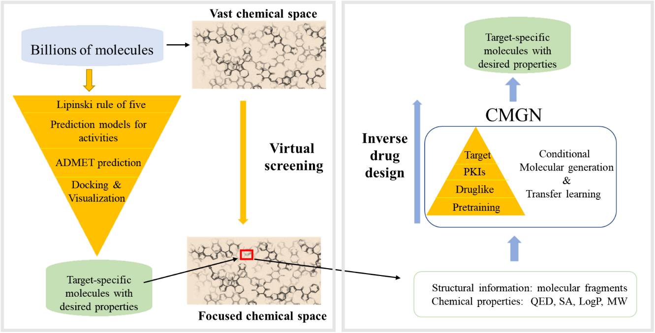 图1. CMGN与传统药物设计对比,及其通过迁移学习及性质调节解决分子逆问题的应用策略