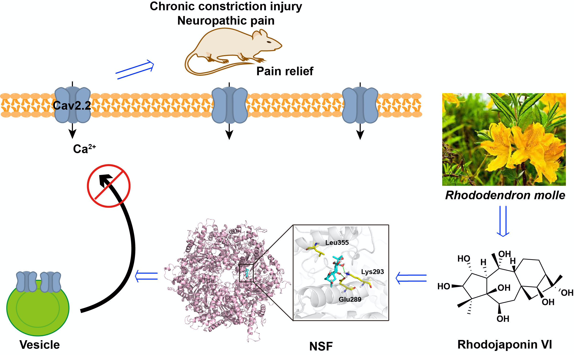 本研究团队发现木藜芦烷毒素Rhodojaponin VI(Rho)在神经性疼痛模型中表现出显著的镇痛效果,并可逆地抑制C纤维传导。考虑到Rho结构修饰的范围窄并且合成的探针活性丧失,研究团队利用热蛋白质组分析(TPP)发现Rho的镇痛活性靶标蛋白为N-乙基马来酰亚胺敏感融合蛋白(N-Ethylmaleimide-Sensitive Fusion protein,NSF),并通过分子生物学和生物物理实验证实NSF为Rho的关键靶标。敲低NSF显著减弱大鼠坐骨神经慢性压迫损伤模型(CCI)的机械痛和热痛敏反应。该研究发现NSF可促进N型钙离子通道Cav2.2的跨膜运输,增加钙通道的电流强度,而Rho可逆转NSF对Cav2.2钙通道的相关作用。因此,木藜芦烷毒素Rho的镇痛作用是通过抑制NSF介导的Cav2.2钙通道跨膜运输而实现缓解神经性疼痛,是一种新型的镇痛机制和有前景的治疗靶标。