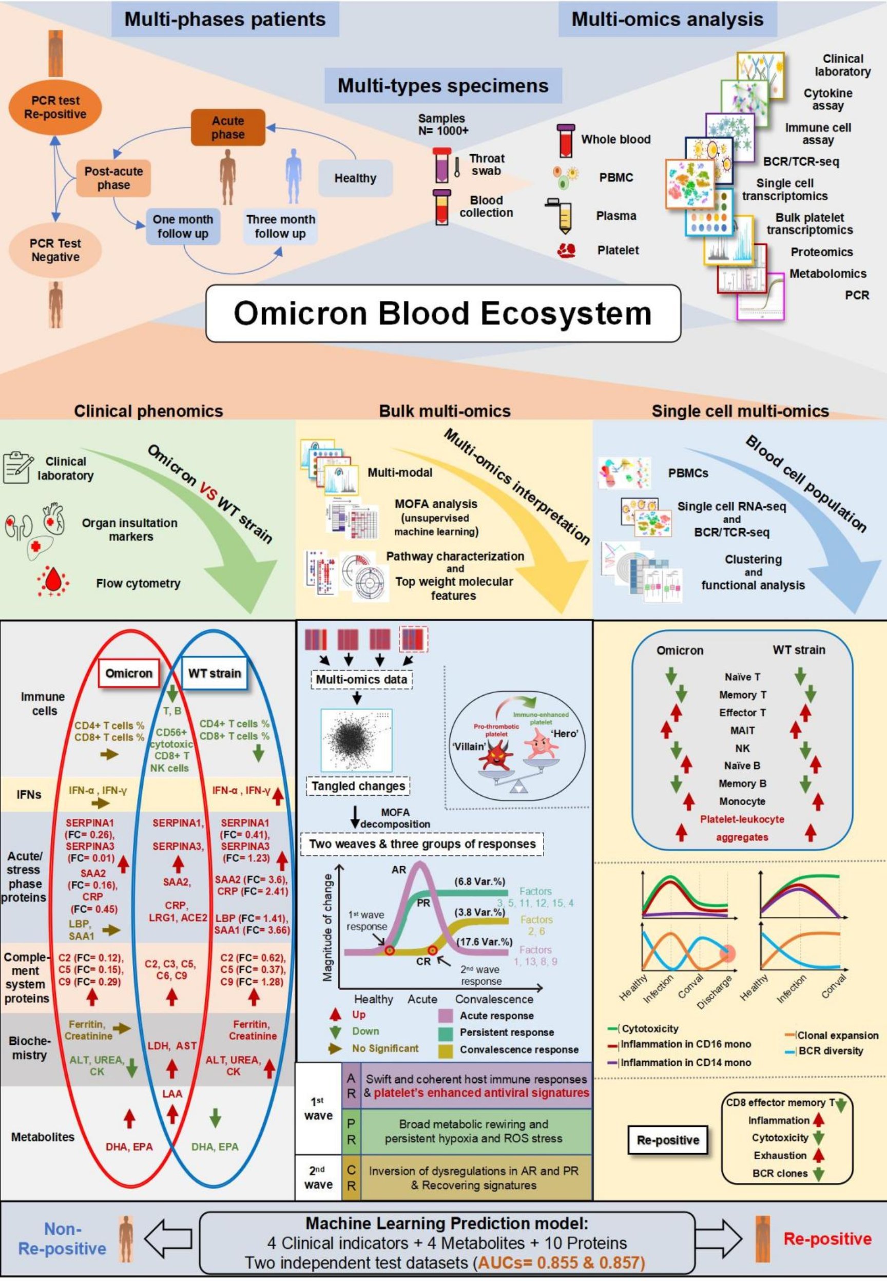 血液生态系统由不同的血细胞、微环境细胞、血浆各成分间复杂而高度协调的相互作用组成,是维持组织器官之间互作的信息纽带。血液生态的失衡是感染及各种其他系统性疾病发生发展的重要根源。因此血液生态的研究对于解析感染等系统疾病的分子景观具有重要价值,对于临床预警、预防及治疗具有重要意义。奥密克戎(Omicron)毒株是迄今为止最广泛关注的变异株,然而相较于原始毒株,公众对其潜在分子机制仍知之甚少。该研究收集了1000多个来自新冠奥密克戎毒株感染者的血细胞和血浆样本,通过对其临床表型、转录组、蛋白质组、代谢组和免疫库等的系统性解析,揭示了新冠奥密克戎感染者血液生态系统中独特的血小板和免疫景观。团队还开发了一个基于多个血浆分子标志物及临床指标的联合机器学习模型,实现了对奥密克戎患者复阳的提前预警,并获得了国家发明专利授权。