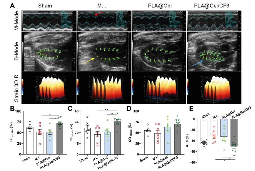 图1. 导电性复合水凝胶(PLA@Gel/CF3)对左心室功能和收缩能力的影响