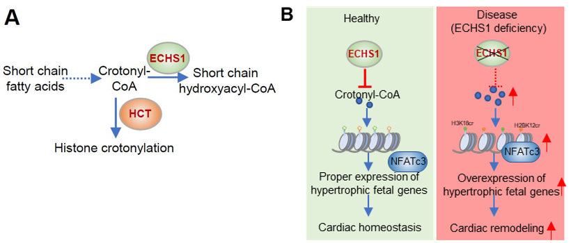 心脏是一个高耗能器官,其中70%-90%的能量来自于脂肪酸代谢,脂肪酸代谢不仅为心肌细胞提供能量,同时会产生许多代谢物(如巴豆酰辅酶A、酮戊二酸等)来修饰组蛋白,从而影响细胞的表观遗传和基因表达。组蛋白的表观修饰在维持心脏稳态过程中发挥重要作用,其中组蛋白巴豆酰化(Kcr)是近年来发现的一种新型组蛋白修饰。ECHS1作为能量代谢关键分子SIRT3的下游参与细胞脂肪酸的β-氧化过程,其能够水解巴豆酰辅酶A,后者可通过组蛋白巴豆酰转移酶(HCT)的作用,参与组蛋白修饰调节(Figure A)。超过60%的ECHS1突变携带者会发生肥厚型或扩张型心肌病。