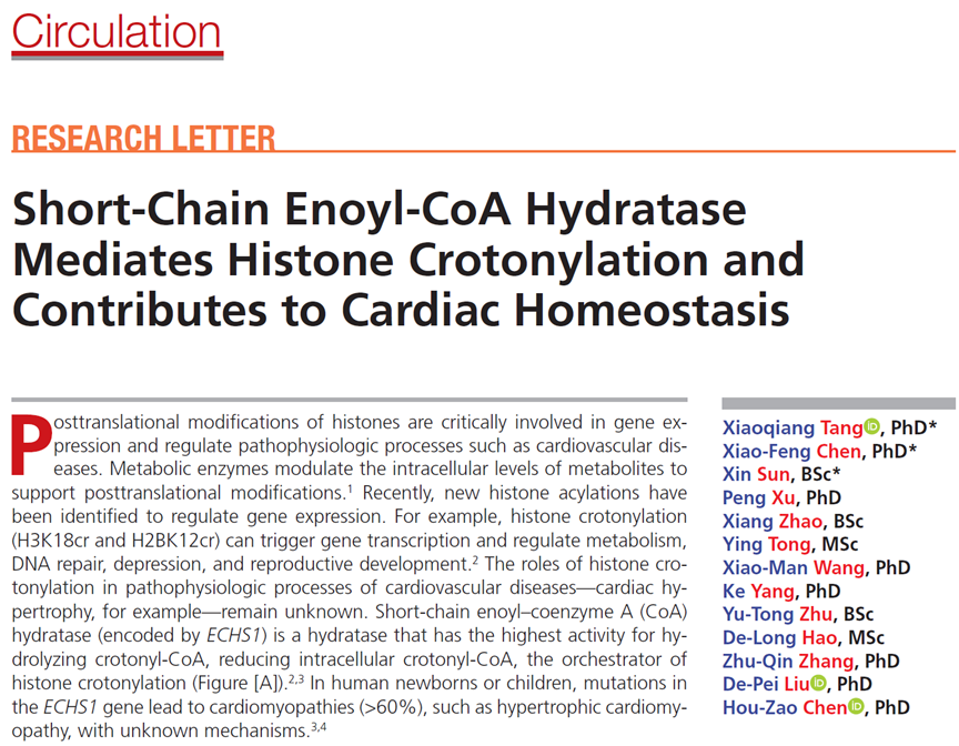 2021年3月9日,米乐mile官方网站基础医学研究所刘德培团队在Circulation上发表题为“Short-chain Enoyl-CoA Hydratase Mediates Histone Crotonylationand Contributes to Cardiac Homeostasis”的论文,研究发现Short-chain Enoyl-CoA Hydratase(ECHS1)在心脏中通过调控巴豆酰辅酶A水平维持心肌细胞稳态,首次揭示组蛋白巴豆酰化修饰在心肌肥厚等心血管疾病中发挥的病理生理作用。