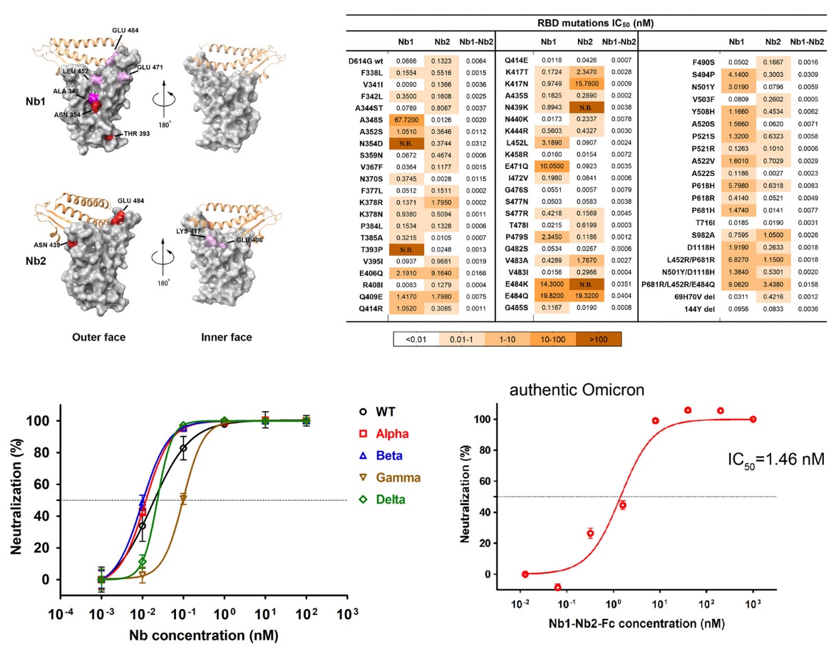 研究者通过融合人IgG1的Fc片段构建成全新形式的人重链抗体(Nb1-Nb2-Fc),从而全面提高了抗体的中和活性、产率、蛋白稳定性并延长了其潜在的半衰期。针对新的Omicron变种,Nb1-Nb2-Fc保持了牢固的亲和力(KD<1.0E-12 M)和强大的中和活性(Omicron活病毒,IC50=1.46 nM)。