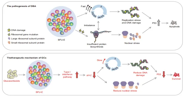 基于以上研究,本研究团队认为,DBA患者在出生后红系造血需求增加的压力下红系祖细胞细胞周期加快,被迫进入细胞周期S期,DNA复制压力增加。由于核糖体蛋白基因突变导致的核糖体蛋白单倍剂量不足,无法满足细胞周期加快的需求,进而导致P53激活、凋亡信号通路激活,红系祖细胞凋亡增加。而糖皮质激素可以通过减慢DBA患者红系祖细胞细胞周期速度,减少红系祖细胞凋亡,进而达到治疗作用。