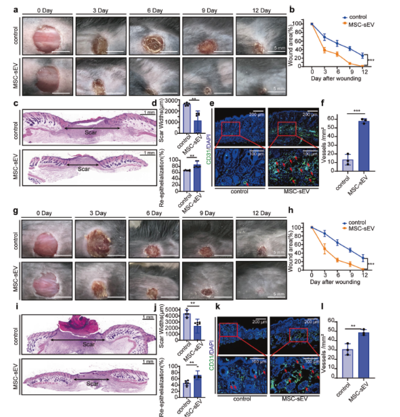 研究团队采用氧化应激诱导内皮细胞衰老模型,发现MSC-sEV减少了衰老细胞标志物,降低了衰老相关分泌表型(SASP),挽救了衰老内皮细胞中的血管生成、迁移和其他功能障碍。在体内自然衰老和2型糖尿病小鼠伤口愈合模型(两者都有衰老的内皮细胞)中,MSC-sEV促进伤口闭合和新血管形成(如下图所示)。机理上,miRNA微阵列显示miR-146a在MSC-sEV中高表达,并且在MSC-sEV处理后在内皮细胞中也上调。miR-146a抑制剂消除了MSC-sEV对衰老的刺激作用。此外,miR-146a可以抑制Src磷酸化和下游靶标VE-cadherin和Caveolin-1。研究数据表明,MSC-sEV通过miR-146a/Src减轻内皮细胞衰老并刺激血管生成。