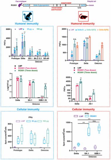 成果简介:新型冠状病毒(SARS-CoV-2)持续变异,表现出更强的传播能力与免疫逃逸特性,不仅对全球公共卫生防控构成严峻挑战,也对现有疫苗的广谱保护能力提出了更高要求。为应对这一科学难题,该研究团队基于Delta毒株刺突蛋白(S)全长序列,引入结构稳定性增强突变,开发了新冠病毒mRNA疫苗RG001,旨在诱导对多种变异株具有交叉保护效力的免疫应答。在非人灵长类动物中,免疫学研究结果显示,两剂RG001疫苗接种后可诱导出针对原始株至Omicron等多种变异株的广谱中和抗体及细胞免疫反应,并有效抑制肺部病毒复制与感染所致的急性肺损伤。在追加第三剂疫苗后,受试动物体内产生了对XBB、JN.1等流行株的中和抗体,同时维持了稳定的T细胞免疫反应,进一步拓展了疫苗的免疫覆盖范围。该研究系统验证了新一代mRNA疫苗RG001在应对新冠病毒变异株方面的广谱性和有效性,为广谱抗冠状病毒疫苗的后续设计和临床转化奠定了坚实的技术基础与动物实验依据。同时,该工作为应对新发突发传染病的疫苗开发建立了应急技术平台。
