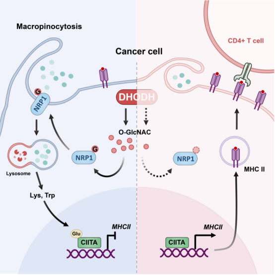 该研究揭示了DHODH通过代谢途径维持神经纤毛蛋白NRP1的O-糖基化修饰及膜定位,促进肿瘤细胞巨胞饮。依赖巨胞饮途径摄取的赖氨酸和色氨酸作为戊二酰辅酶A的供体,能够增强肿瘤细胞转录激活因子CIITA的戊二酰化水平,抑制内源性主要组织相容性复合体MHC-II类分子的转录,从而导致肿瘤细胞免疫逃逸。使用DHODH抑制剂能够显著抑制荷瘤小鼠肿瘤生长,通过增强肿瘤免疫原性招募更多免疫细胞浸润,有效逆转肿瘤对PD-1抗体治疗抵抗性。该研究首次将肿瘤细胞巨胞饮和免疫原性及其免疫治疗关联起来,为逆转“冷肿瘤”免疫治疗抗性提供了新思路。