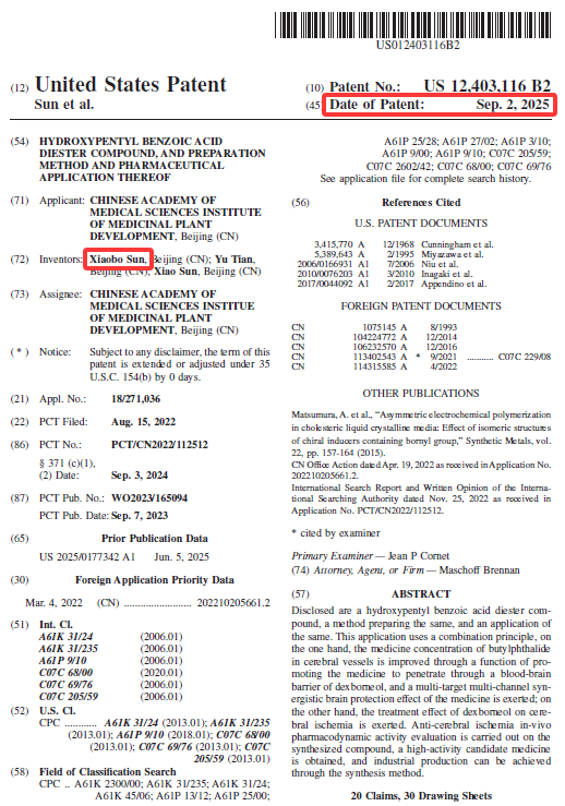四、药植所在治疗缺血性脑卒中1.1类新药取得重大进展(美国专利US 12,403,116B2)