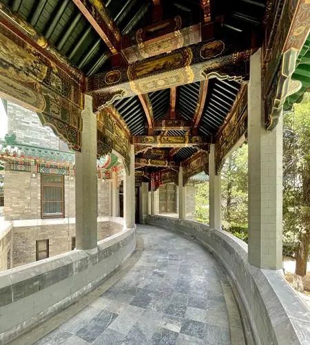 9号院弧形廊是传统廊式建筑,结构复杂,包括多种梁架和构件,形成了独特的视觉效果。月季图案、中式山水画、西式风景画并置,还有与各楼连接处的多样彩画图案,共同营造了和谐宁静的视觉体验。