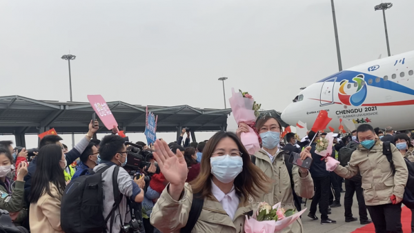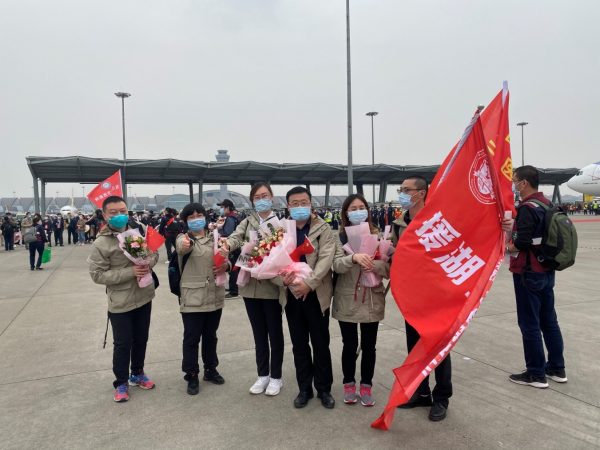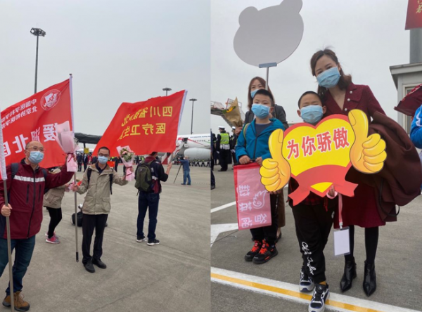 4月7日下午,输血所6名逆行勇士随四川省最后一批援湖北医疗队凯旋。四川省委省政府在双流机场举行隆重的欢迎仪式。省委书记彭清华到机场迎接并讲话,省委副书记、省长尹力主持欢迎仪式,省卫生健康委党组书记沈骥、主任何延政和输血所党委书记陈勇军等参加了欢迎仪式。