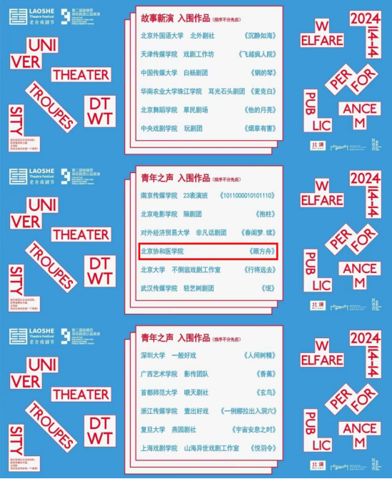 9月27日上午,大戏看北京·2024第八届老舍戏剧节开幕。开幕式上,公布了“第二届鼓楼西高校剧团公益展演”的入围作品。