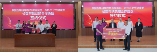 为更好实现长期帮扶,所院与百色市卫生健康委本着“资源共享、优势互补、互惠互利、共同发展”的原则签订战略合作协议,并向百色市医疗机构捐赠价值100万元的药品及远程医疗设备等物资,旨在进一步提升百色市诊疗服务能力,助力血液病技术人才培养,最大限度缓解当地就医难问题,百色市卫生健康委党组书记、主任黄再波代表百色市卫生健康委签约。