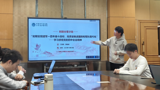 会上,支部书记农张蔚同志带领全体党员学习党的二十届四中全会公报要点,回顾“十四五”时期取得的重大成就,展望“十五五”时期的发展目标。刘俊希、郭诚成两位同志分别围绕“推进祖国统一大业”和“高质量推进国防和军队现代化”作主题发言,并与党员同志们就相关问题展开热烈讨论。大家一致认为,在复杂严峻的国内外形势下,展示军队现代化水平是维持和平、反对侵略的有力方式,祖国的统一大业必定在两岸同胞的共同努力下得到实现。