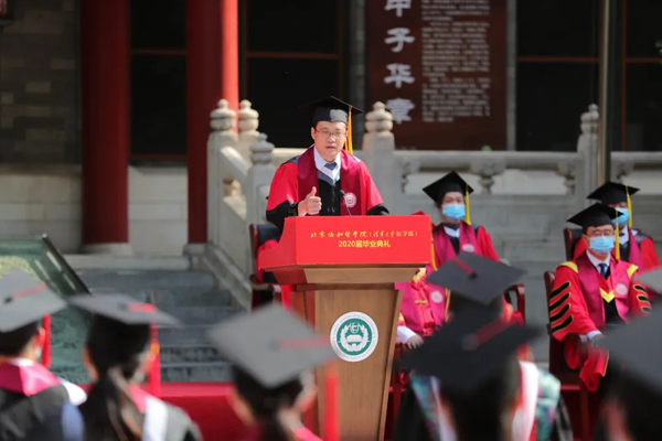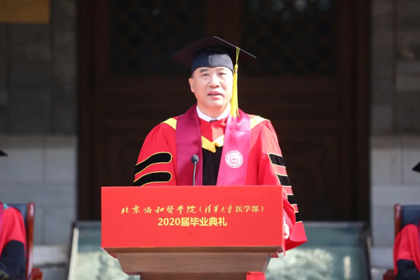 我校妇产科学系主任郎景和院士作为教师代表为毕业生送上深情嘱托,他说“严谨,博精,创新,奉献”高度概括和集中体现了医学的科学性和人文性,也完美地描绘了协和的历史和愿景。他在现场分享了一首名为《永远记着老师》的诗,表达对先哲大师们的崇敬缅怀,希望与协和学子们一道前行,不负韶华。