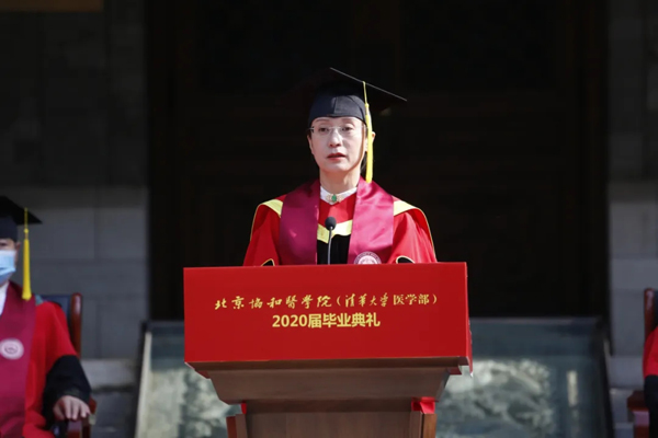特邀嘉宾、世界卫生组织原总干事、第十三届全国政协常委陈冯富珍女士因疫情原因,无法到达现场。她通过视频在致辞中说道医学是照护生命的崇高职业,希望协和学子在未来的事业中能秉持“专注,自省,悲悯”的情怀,脚踏实地地践行协和“科学济人道”的精神,专业敬业地完成对患者的照护,对学生的教导,对科学的研究。