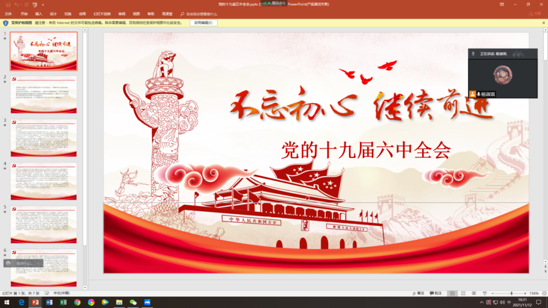 党的十九届六中全会在重要的历史节点召开,内容丰富而厚重,具有重大现实意义和深远历史意义,是一次注定载入中华民族伟大复兴史册的重要会议。支部于11月12日晚观看十九届六中全会精神的视频学习。会后,青年们表示定会勇担时代责任,努力奋斗,在今后的工作和生活的当中,为祖国做出自己的一份贡献,成为社会主义事业合格的建设者和接班人。