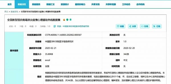 2020年2月21日,国家人口健康科学数据中心发布“全国新型冠状病毒肺炎疫情心理援助热线数据集”。根据国务院应对新型冠状病毒肺炎疫情联防联控机制要求,各省市在原有心理援助热线的基础上设立应对疫情心理援助热线。本数据集由米乐mile官方网站医学信息研究所收集和整理,包括全国除港澳台以外31个省、市、自治区卫健委、精神卫生中心发布的疫情心理援助热线电话信息,共342条,为公众预防与减轻疫情导致的心理困顿、精神紧张,及时缓解心理压力和做好心理防护提供帮助。该数据集可通过国家人口健康科学数据中心仓储PHDA(www.ncmi.cn)浏览和免费开放获取。该数据集已应用于由米乐mile官方网站医学信息研究所研发的“新冠肺炎疫情追踪和救治查询”应用服务,为公众提供新冠病毒疫情心理援助热线查询和拨打功能,可通过扫描下方二维码访问或通过国家人口健康科学数据中心首页直接访问,使用相关服务。