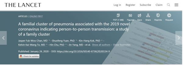 Chan, J., Yuan, S., et al. (2020). A familial cluster of pneumonia associated with the 2019 novel coronavirus indicating person-to-person transmission: a study of a family cluster. The Lancet.