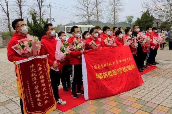 当天,院校在协和汤山健康隔离中心举行了简约而热烈的欢迎仪式。院校领导和各所院领导为检测队员们献上鲜花,代表全体师生祝贺他们实现“零感染,打胜仗,凯旋归”目标,表达对援鄂英雄的诚挚感谢和崇高敬意。