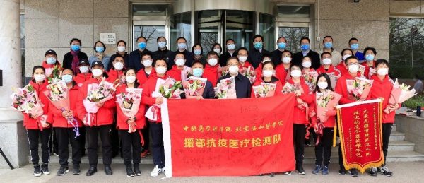 肿瘤医院刘芝华副院长代表所院发言,她说,“检测队员们代表院校科研工作者和广大协和人冲锋到一线,向国家交出了一份圆满的答案,由衷地为大家自豪和骄傲,欢迎大家平安回来。”