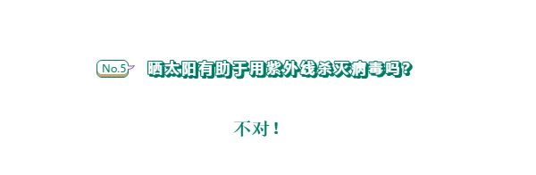 科学依据:按照《消毒技术规范》规定的要求,高强度紫外线新灯的辐照强度应大于180uW/cm2(253.7nm,距离1m处),新普通紫外线灯管辐射强度大于90uW/cm2为合格。正在使用中的灯管辐射强度最低应达到70uW/cm2暂可使用,但必须延长照射时间。若紫外线光源的强度低于40uW/cm2:,则再延长照射时间也不能起到满意的杀菌作用,即应停止使用。但是就太阳光而言,即使是夏天正午阳光最强的情况下,其紫外线强度也不过是10uW/cm2(100mW/m2),低于最低有效强度40uW/cm2,不可能起到有效的杀菌作用。[5]