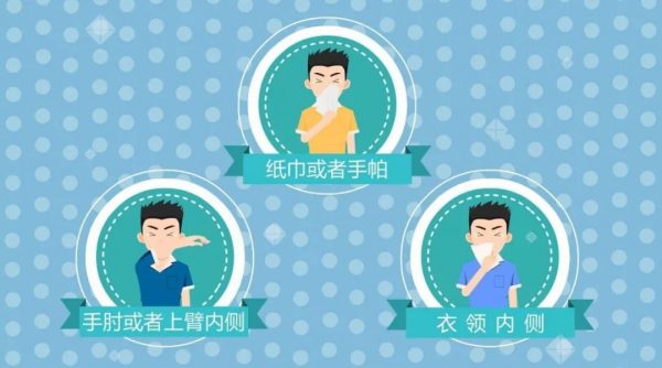 打喷嚏、咳嗽时用纸巾捂住口鼻,纸巾不在身边要抬手用肘关节处的衣服捂口鼻(注意不要直接用手掌!),之后丢弃纸巾到有盖垃圾桶(有条件的话最好单独准备一个有盖垃圾桶,或用第二层纸巾包裹同样可行),然后尽快彻底洗手。