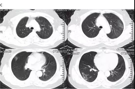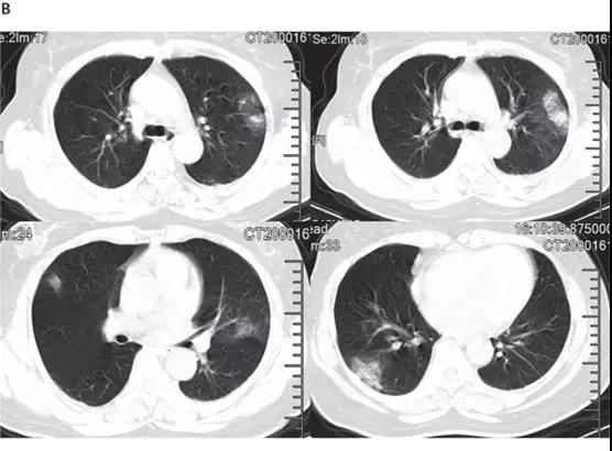 随后的胸部CT显示双侧毛玻璃样混浊,而实变消除(见下图)。