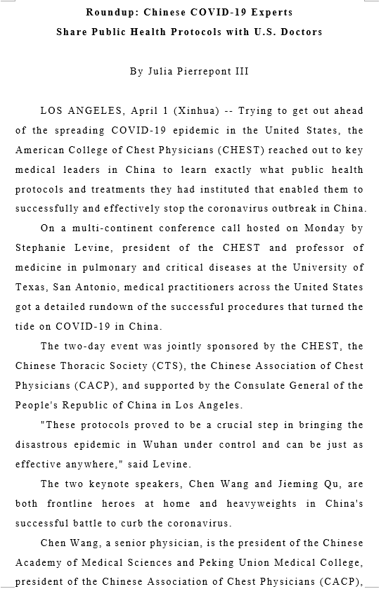 编者的话 3月30日,美国胸腔医师学会(CHEST)、中国呼吸学会、中国呼吸医师协会和中国驻洛杉矶总领事馆共同举办了2场“中美携手抗击新冠:中国高级别专家向美国同行分享最前线经验”网络研讨会,研讨会由美国胸腔医师学会主席StephanieLevine教授主持,米乐mile官方网站院长王辰院士、上海瑞金医院院长瞿介明、中日友好医院副院长曹彬、中日友好医院呼吸与危重症医学科主任詹庆元等中国顶尖专家向美国医护人员分享了中国抗击新冠肺炎的成功经验,引起中美两国医学界和媒体广泛关注。