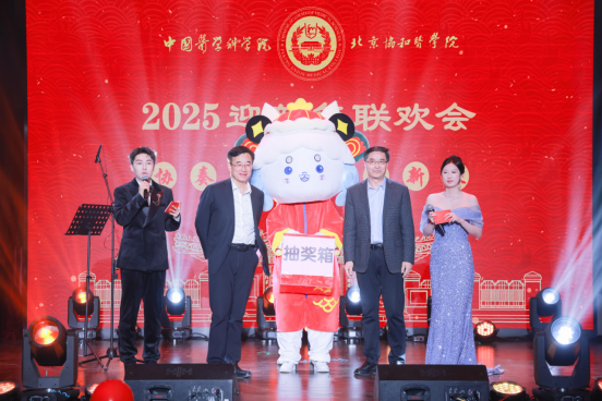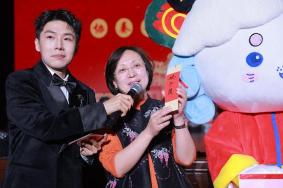 晚会现场,王辰院校长、邓海华书记、李青副院校长、张勤副书记在吉祥物蛇UU的陪同下与同学们互动抽奖,现场氛围热烈非凡。