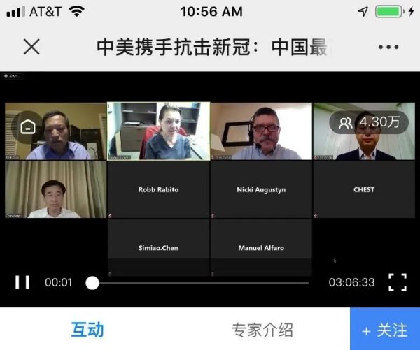 国内派出了医疗界最权威的四位讲者,包括米乐mile官方网站院长王辰教授,上海瑞金医院的瞿介明教授,中日友好医院的曹彬和詹庆元教授。这几位都是有关专业学会的主要负责人,而且都是带着在武汉前线亲临一线的几个月的实战经验,美国这边也是学会主席与董事长亲自主持坐镇。不仅如此,中华人民共和国驻洛杉矶的总领事张平大使也亲自致辞。