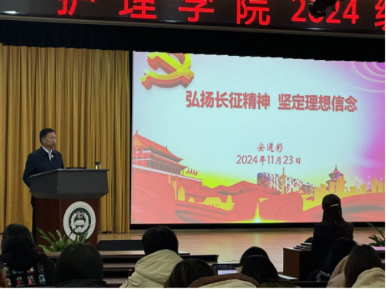 安道彩书记带领同学们回顾历史,探寻长征精神源头。他指出,第五次反围剿败北,红军被迫战略转移,民族危在旦夕,在此绝境,长征精神磅礴而生。将家国大义置顶,理想信念如磐,坚信正义必临;无畏艰难,愿付一切护国安民;独立自主、实事求是,扎根现实觅生机;顾全大局、严守纪律、紧密团结,聚磅礴之力;依靠人民、生死与共、不懈奋斗,固胜利之本。他表示,协和学子,当牢记使命,追红色足迹,练强本领,承先辈志,为健康中国建设添砖加瓦。
