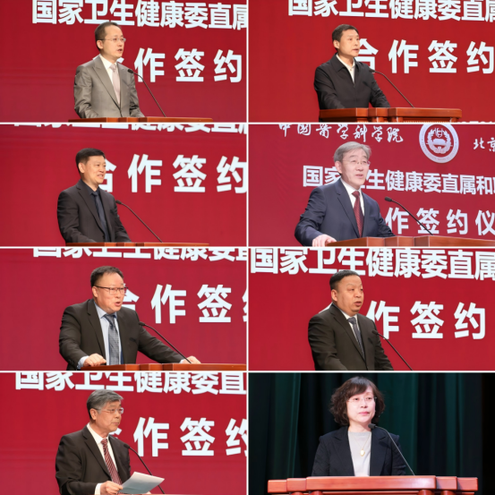 国家卫生健康委卫生发展研究中心诸宏明主任、国家心理健康和精神卫生防治中心付强主任、国家卫生健康委妇幼健康中心许宗余副主任、国家卫生健康委医疗管理服务指导中心翟晓辉主任、国家卫生健康委医院管理研究所王凯副所长、中国健康教育中心米锋副主任、国家卫生健康委职业安全卫生研究中心樊晶光主任分别发表讲话,各单位均表示高度重视与院校的战略合作,将以此次合作为起点,根据协议,强强联合,携手打造卫生健康事业高质量发展的“示范工程”,着力为国家培养一流拔尖创新医学人才,为护佑人民健康、服务国家战略做出更大贡献。