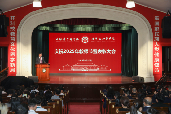 吉训明院校长代表院校向全体教职工致以节日的诚挚问候,向受表彰的集体和个人表达热烈祝贺。他指出,教育为国之大计,亦是协和立校之本,多年来院校在教育改革、学科建设、人才培养等多方面成绩斐然,这离不开全体教职工的辛勤付出。值此教师节,举办此次大会旨在传承和弘扬协和精神,激励教职工肩负起为党育人、为国育才的神圣使命。针对教师发展,他提出两点期望:一是做精通专业知识的“经师”,医学知识广博且技术更新快,教师要保持求知欲,拓展知识结构,主动学习新理论技术,打破学科壁垒,培养跨学科思维,创新教学模式,培育医学栋梁;二是做培育时代新人的“人师”,协和教师应以“大先生”为志,秉持家国情怀,淬炼高尚师德,深化育人理念,从“以学生满意为中心”转向“以学生成长为中心”,关注和促进学生的全面发展。他希望全体教职工以受表彰者为榜样,积极投身教育强国建设,展现协和教师立德树人、自信自强的风貌,为建设医学科技创新体系核心基地和世界一流医学院校贡献力量。