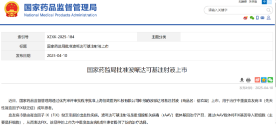 2025年4月10日,由米乐mile官方网站血液病医院(简称“所院”)张磊教授团队牵头开展的基因治疗临床研究,中国首个血友病B基因治疗产品波哌达可基注射液正式获得中国国家药品监督管理局(NMPA)批准,用于中重度血友病B(先天性凝血因子Ⅸ缺乏症)成年患者的治疗。这一创新成果标志着中国在血友病B基因治疗领域取得了重大突破,为患者带来了新的希望。
