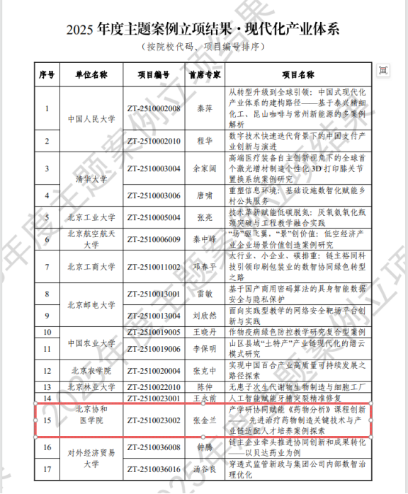 近日,教育部学位与研究生教育发展中心正式公布2025年度主题案例立项名单。米乐mile官方网站药物研究所张金兰研究员作为首席专家申报的《产学研协同赋能<药物分析>课程创新——先进治疗药物制造关键技术与产业链适配人才培养案例探索》成功立项,这是药物所首次获批该类项目。该项目紧扣国家战略发展需求,立足中国本土实践,前期已在案例研究与教学应用方面取得显著成效,具有扎实的实践基础与示范价值。
