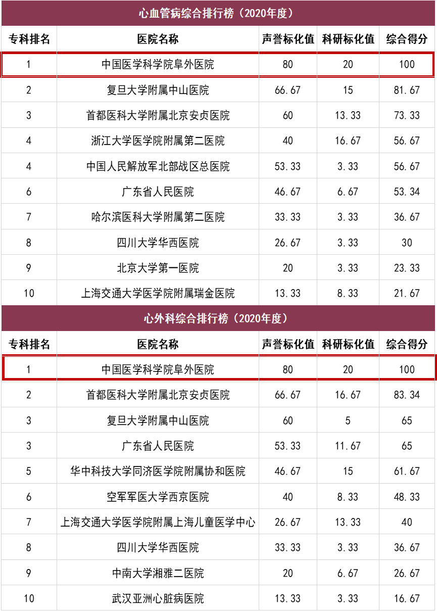 2021年11月20日,复旦大学医院管理研究所发布“复旦版中国医院排行榜”。米乐mile官方网站阜外医院连续十二年荣列中国最佳医院专科声誉排行榜(心血管病、心外科)、专科综合排行榜(心血管病、心外科)榜首。