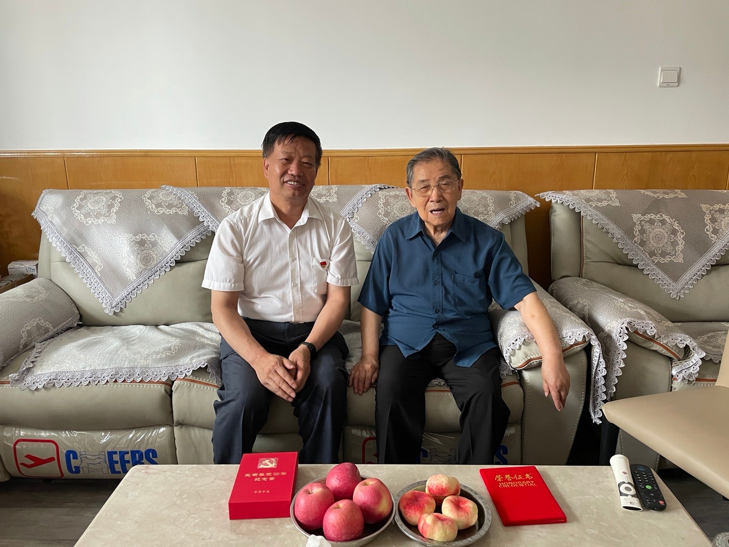 在庆祝中国共产党成立100周年之际,为了传递党的温暖,进一步增强老党员的荣誉感、归属感和使命感,弘扬老一辈共产党员英勇顽强甘于奉献的革命精神,6月25日,护理学院党委副书记安道彩同志带领党政办公室主任和退休党支部书记,前往老党员家中开展走访慰问,并向他们及离世老党员家属送去“光荣在党50年”纪念章,送去学院党委和广大师生的诚挚问候和崇高敬意。