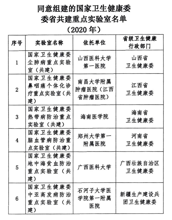 根据专家组的论证意见,经研究,2020年12月21日国家卫生健康委正式印发了《国家卫生健康委关于同意组建尘肺病重点实验室等6个委省共建重点实验室的通知》(国卫科教函〔2020〕484),同意新建国家卫生健康委尘肺病重点实验室等6个国家卫生健康委委省共建重点实验室。