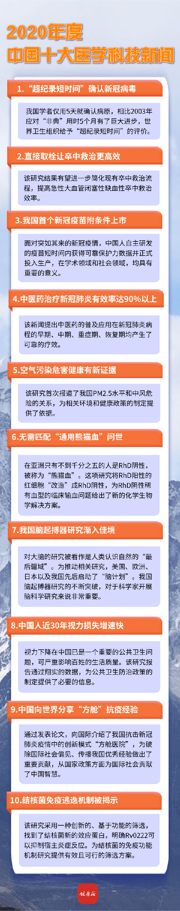 国内医学科技新闻部分,对2020年《科学》《自然》《柳叶刀》《新英格兰医学杂志》等权威期刊和各专科排名靠前的期刊进行检索,选取《健康报》《光明日报》《科技日报》等20多家国内主流媒体和门户网站报道过的,以中国学者为主要完成人的医学科技新闻,共93篇新闻列入备选条目。