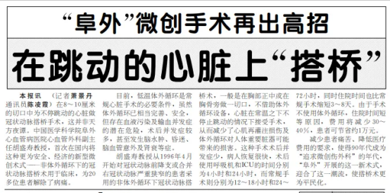 健康报在头版报道了中国第一例不停跳冠脉搭桥手术