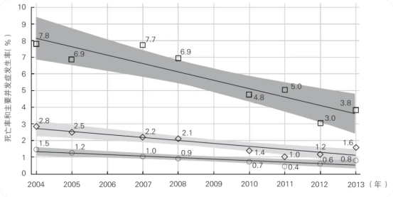 自2004年至2013年,我国冠状动脉搭桥患者死亡率(图中标记◇)和主要并发症发生率(图中标记□)情况
