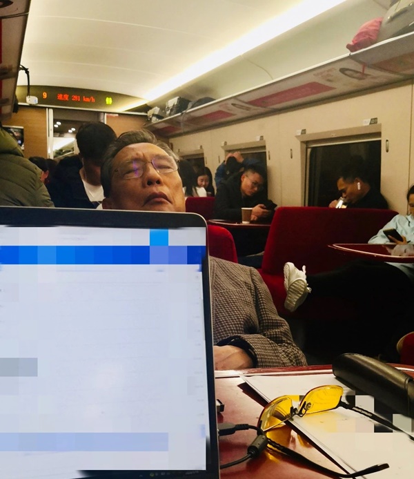 钟南山在赶往武汉的高铁餐车上。(苏越明摄)