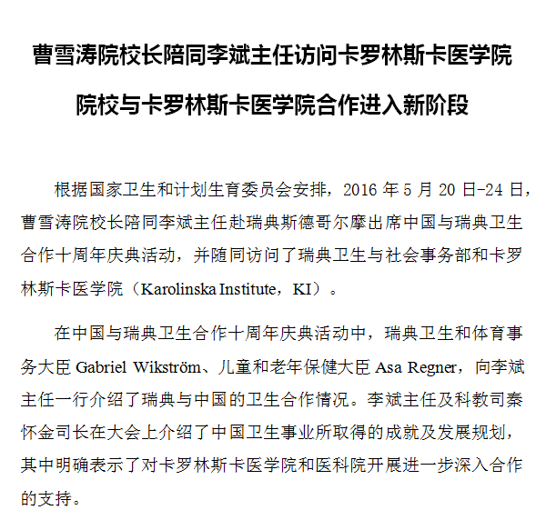 曹雪涛校长陪同李斌主任访问卡罗林斯卡医学院