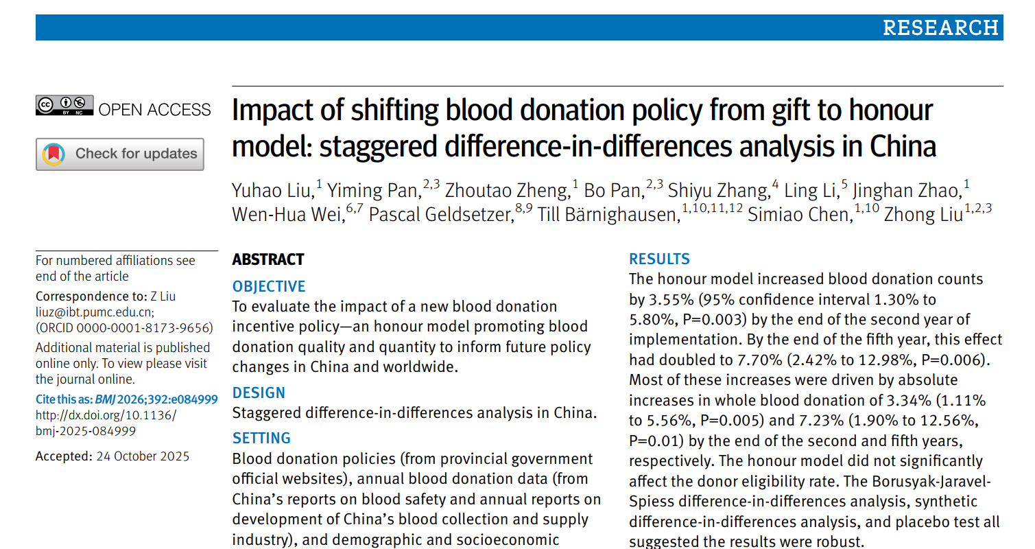 院校刘忠/陈思邈团队在BMJ 发文,提出并利用准实验方法解析无偿献血“荣誉模式”激励机制